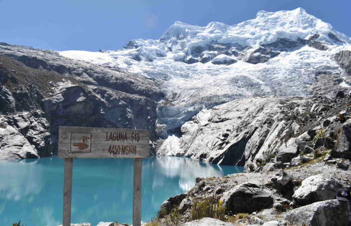 Se encuentra ubicada en la región natural puna, justo en la base del glaciar del nevado Hualcán, cuyo deshielo vierte a alimentar esta laguna, el color de sus aguas es turquesa intenso. Que una década atrás se encontraban flotando cúmulos de hielo. Su profundidad aproximada es de 45 metros cuya superficie es de 207,585 m² y el volumen de agua de 9'250,938 m³, no existe vegetación por ser zona morrénica, evidencia de acelerado retroceso glaciar. Para acceder a la laguna el recorrido inicia en las pampas de Shongil, hasta donde se llega por una trocha carrozable, desde este punto se camina 3 horas por un camino de herradura habilitado que pasa por la laguna Rajupaquinan hasta llegar a la laguna 513. Dicho acceso fue construido con el objetivo de realizar los trabajos de desembalse en el año 1992, quedando rastros de ello en las chozas rústicas construidas de piedra con techo de paja que sirvió de refugio a los trabajadores de la obra. Se construyeron 6 bocatomas, 3 se aprecian a simple vista en la superficie y 3 permanecen bajo el agua. De contar con disponibilidad de tiempo la tuta continua hacia el Norte, cuesta arriba hacia shumakpunta el cual es el paso para completar el circuito de caminata saliendo a la laguna Auquiscocha, el camino no está bien definido, por lo que se tiene que caminar sobre inmensas rocas firmes y sueltas ocasionadas por la erosión y rajaduras que han sufrido en el proceso morrénico considerando este tramo como el más difícil del circuito. Apto solo para personas que tienen preparación física. Complementa el recorrido las vistas a los nevados de la cordillera, el bosque de queñuales, la quebrada por donde discurre el riachuelo que salen de las lagunas y los arbustos silvestres que en temporada de lluvias florecen, además las aves de la región que alegran el día con sus cantos.