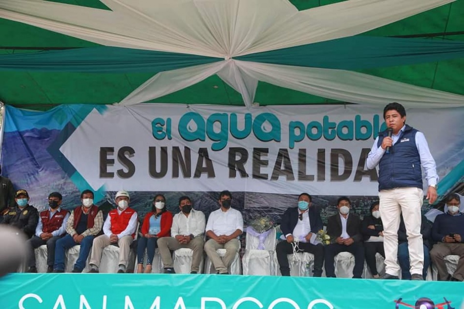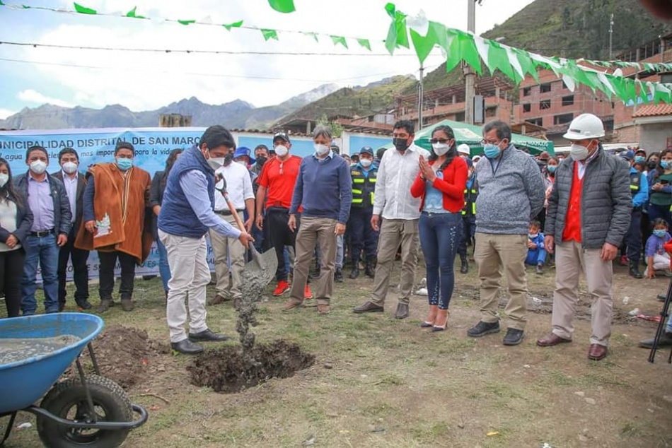 El gobernador regional de Áncash, Ing. Henry Borja Cruzado, asistió a la ceremonia de colocación de la primera piedra del proyecto de agua, alcantarillado y planta de tratamiento en el distrito de San Marcos, como invitado de Honor de la Municipalidad de San Marcos.. Esta ceremonia contó también con la presencia del representante del Ministerio de Vivienda, Moisés Jara; el alcalde de San Marcos, Cristian Palacios Laguna; el Ing. David Vásquez Castillo, gerente de Gestión Social de la minera Antamina; funcionarios de esta comuna, así como pobladores.. Esta obra de agua, alcantarillado y planta de tratamiento, anhelado por la población de la zona, tendrá una inversión de S/ 134 millones y será ejecutada a través de la modalidad de obras por impuestos entre la comuna de San Marcos y la minera Antamina.. En su intervención, la autoridad regional indicó que esta obra será de beneficio para la población pues podrá tener agua más limpia, un reservorio y una planta de tratamiento. Destacó además que con esta ejecución se contribuirá con reactivar la economía en la zona.. También resaltó que el Gobierno Regional de Áncash tiene dos proyectos en el distrito de San Marcos que ya se están trabajando. Estos son el Instituto Superior Tecnológico Público San Marcos y el Puesto de Salud para beneficio de la provincia de Huari.. Enfatizó que se vienen ejecutando diferentes obras por más de 80 millones. Entre ellas están el mejoramiento y ampliación del sistema de saneamiento básico del caserío de Chucos del distrito Huántar; así como los servicios básicos de agua potable y alcantarillado en el centro poblado El Porvenir del distrito de Rapayán.. Asimismo, el mejoramiento y ampliación del sistema de riego por goteo en los sectores de Pampacolca y Paucas, del distrito de Rahuapampa. Además, la implementación del sistema de riego tecnificado en la localidad de Contán, sector Nueva Victoria, del distrito de Anra.. Además, el mejoramiento y ampliación del servicio de agua para riego en los sectores de Cuncuya, Chambruco, del distrito de Uco; la creación del sistema de riego tecnificado en los sectores de Antapaccha, Ampas Centro y Chucpun en el centro poblado de Ampas del distrito de Huari; la creación del servicio de protección en el margen izquierdo del río Puchca en la localidad de Masin, distrito de Masin.. Finalmente, el sistema de riego en la localidad de Santa Rosa de Jahuan del distrito de Huacchis; así como la ampliación del servicio de riego del canal abierto en la localidad de Vincocota, distrito de Rahuapampa.