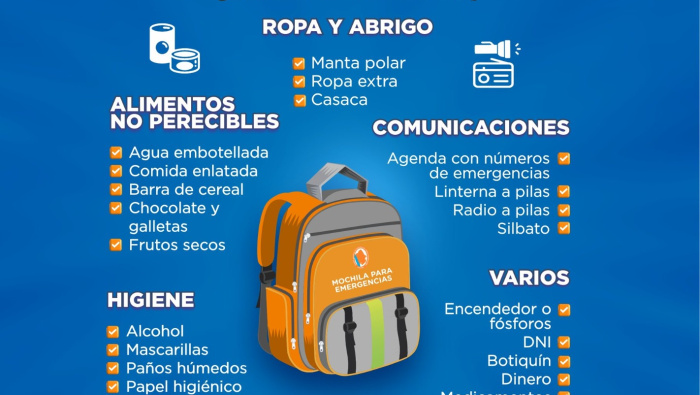 El funcionario reiteró también la importancia de contar con una mochila de emergencia, la cual debe incluir alimentos no perecibles como agua embotellada, comida enlatada, frutos secos, cereales y chocolates; así como artículos de higiene personal como alcohol, mascarillas, paños húmedos, papel higiénico y toallas de mano. Además, recomendó incorporar insumos esenciales como un silbato, radio a pilas, fósforos o encendedor, bolsas plásticas, medicamentos y dinero en efectivo.