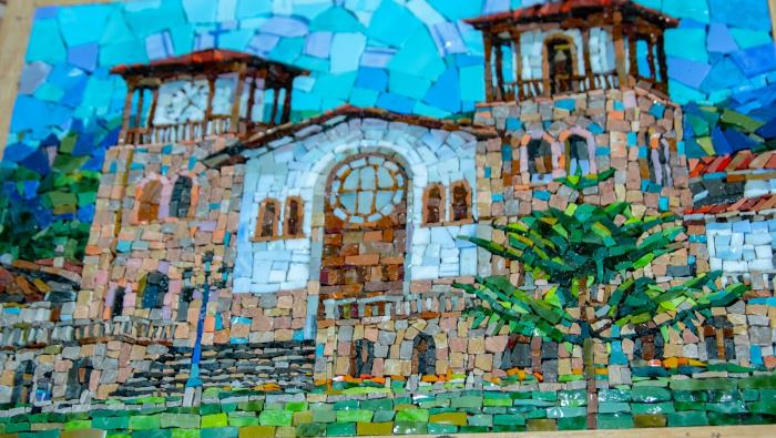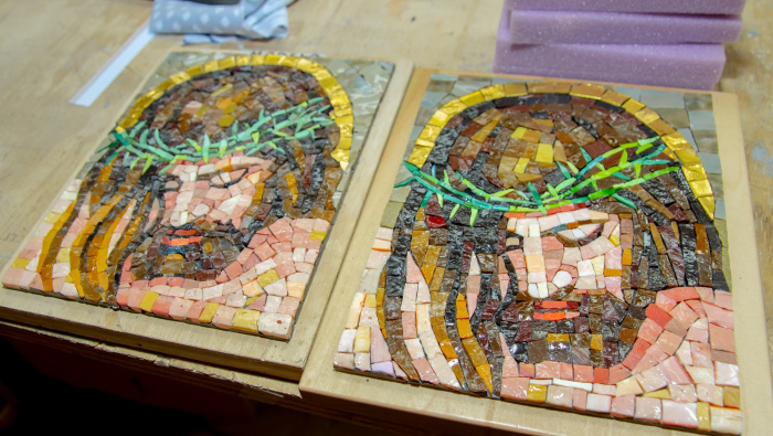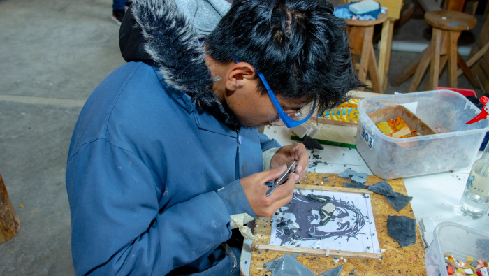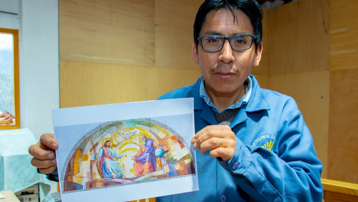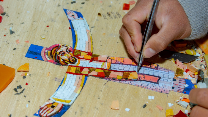 Actualmente trabaja en un nuevo mosaico para un cofre que será enviado a Lima: un Cristo crucificado armado pieza por pieza con pinzas y una paciencia infinita.