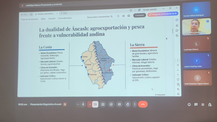 Durante la sesión también se presentaron los avances de la consultoría para el diseño y elaboración de diagnósticos productivos departamentales, estudio que identificó el potencial de la región, tanto en la costa como en la sierra, para albergar un centro de innovación que promueva la industrialización y el desarrollo tecnológico del sector productivo.
