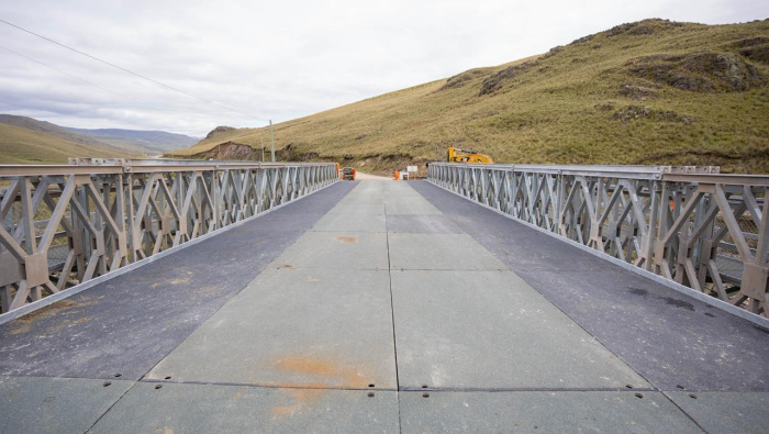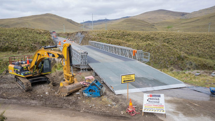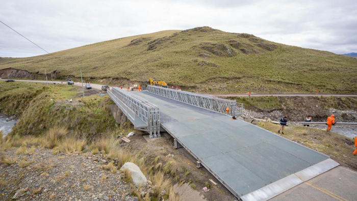 La moderna estructura metálica, de 30 metros de longitud y doble carril, permitirá restablecer el tránsito en el kilómetro 523+350, luego de la interrupción ocasionada por las intensas lluvias y el incremento del caudal del río, que afectaron esta importante vía nacional.