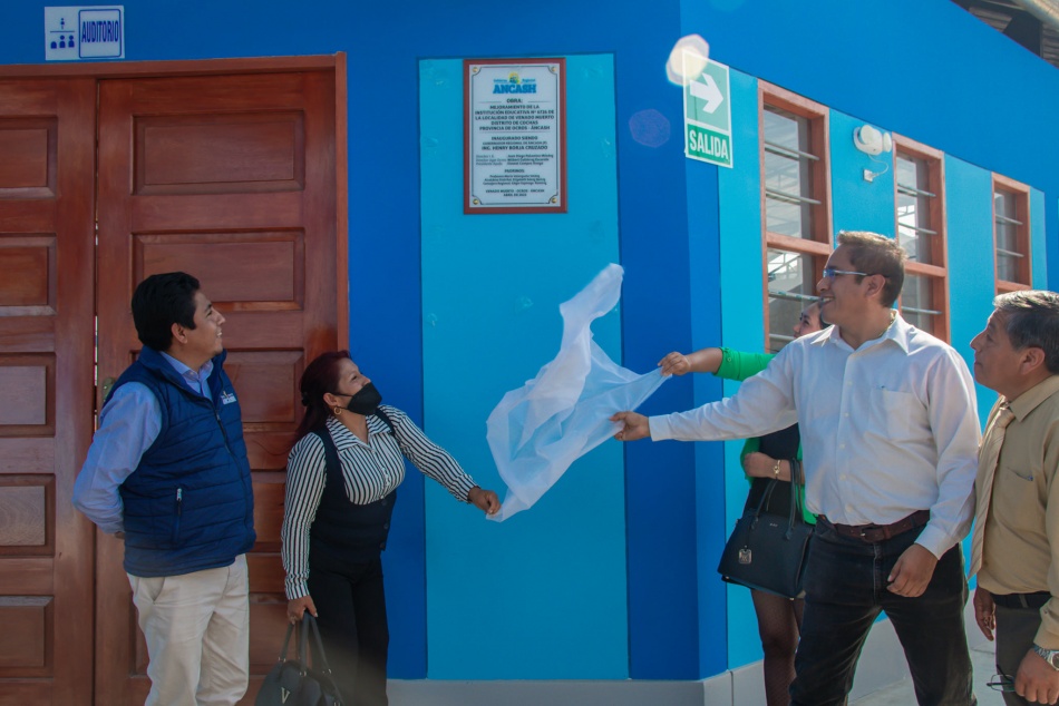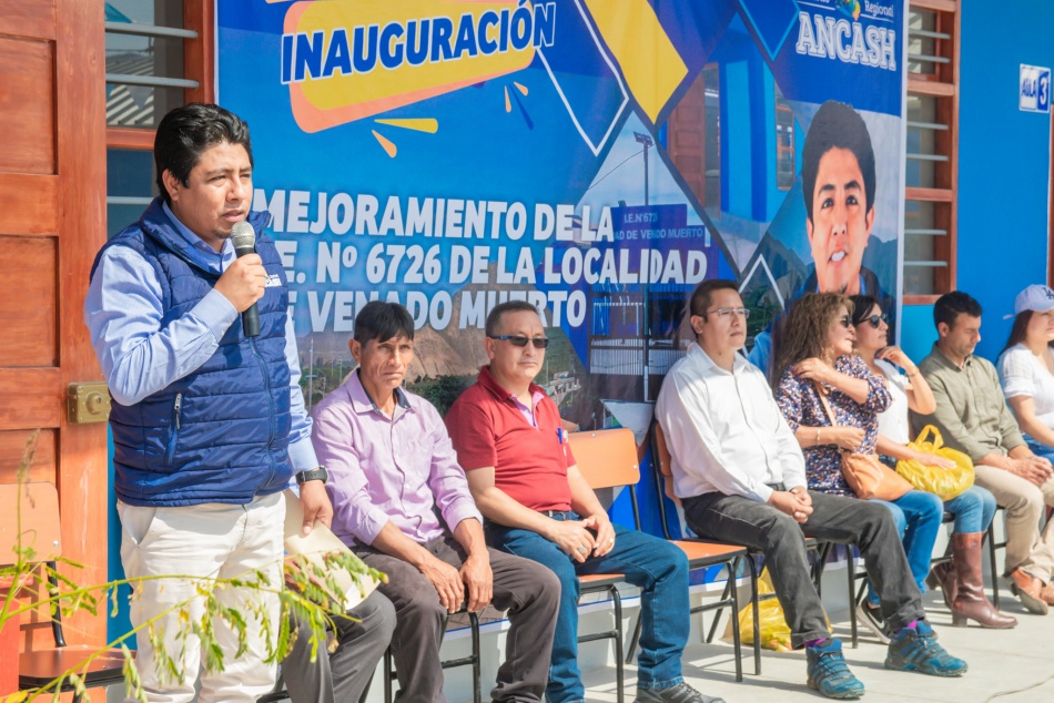 Con la finalidad de contribuir con el mejoramiento de la calidad educativa en las zonas rurales en la localidad de Venado Muerto, Distrito de Conchas provincia de Ocros, el Gobierno Regional de Áncash inauguró una moderna Institución Educativa N°6726, que benefician a los alumnos de los niveles primario y secundario.. La institución educativa N° 6726, se mejoró con una S/ 5'109,220.41 el renovado plantel cuenta con la construcción de 06 aulas, 02 talleres, 01 aula de cómputo, 01 biblioteca, 01 ambiente de secretaría, 01 ambiente de dirección, 01 ambiente de sub dirección, 01 ambiente de sala de profesores, 02 ambientes de servicios higiénicos, la construcción de 01 comedor, cocina y servicios higiénicos.. El gobernador regional de Áncash, Ing. Henry Borja Cruzado, señaló este colegio cuenta con una moderna infraestructura, totalmente equipado para que los estudiantes y profesores tengas todas las comodidades y puedan realizar sus clases “Estamos llegando a los lugares donde muchos gobernadores nunca llegaron y nunca dieron un sol de inversión para estos pueblos que tanto necesitan”.. Así mismo el Ing. Henry Borja Cruzado, hizo el pedido para que el colegio ahora se llame I.E Nº 6726 Francisco Espinoza Montesinos en reconocimiento al Concejero de Ocros que falleció por el Covid 19.. El concejero regional por Ocros, Edgar Espinoza, felicitó al gobernador regional, por hacer realidad este colegio que beneficia a los estudiantes en su formación.. “Me siento bastante gratificada que esta obra de gran envergadura ahora es una realidad después de 10 años gracias al gobernador regional, Ing. Henry Borja, en beneficio de toda la población” indicó muy emocionada la alcaldesa de Cochas, Elizabeth Sáenz.
