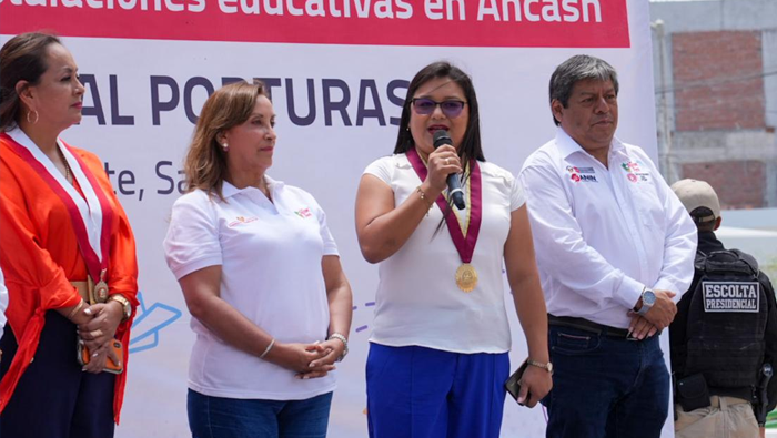 Durante la ceremonia la dignataria peruana resaltó la entrega de estas nuevas infraestructuras educativas a cargo de la Autoridad Nacional de Infraestructura (ANIN). En la comitiva del Ejecutivo también participó el presidente del Consejo de Ministros, Gustavo Adrianzén, y el jefe de la ANIN, Hernán Yaipén.