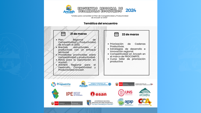 Como parte de los trabajos de aprobación del Plan Regional de Competitividad y Productividad de Áncash al 2033, el Gobierno Regional de Áncash, a través de la Gerencia de Desarrollo Económico, en coordinación con el Grupo Propuesta Ciudadana y el Consejo Nacional de Competitividad del Ministerio de Economía y Finanzas realizarán el “Encuentro Regional de Desarrollo Económico Ancash 2024”.