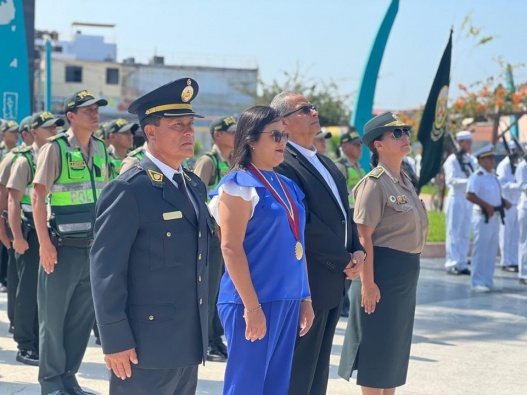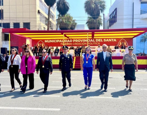 La vicegobernadora regional de Áncash, Angelly Epifanía Chávez, participó, en Chimbote, de la ceremonia de Izamiento y del Desfile Cívico-Militar por el 74° Aniversario de Creación Política de la Provincia del Santa.