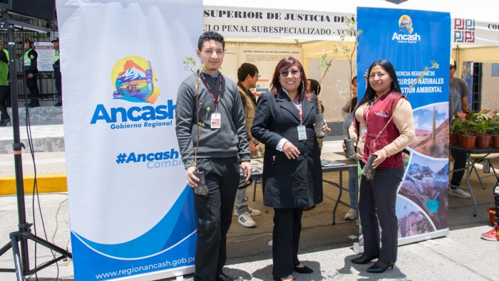 El evento se inauguró con la presencia del presidente de la CSJAN, Dr. Marcial Quinto Gomero, y la presidenta de la Comisión Distrital de Gestión Ambiental, Dra. Melicia Aurea Brito Mallqui, en el frontis de la plaza de armas de Huaraz.