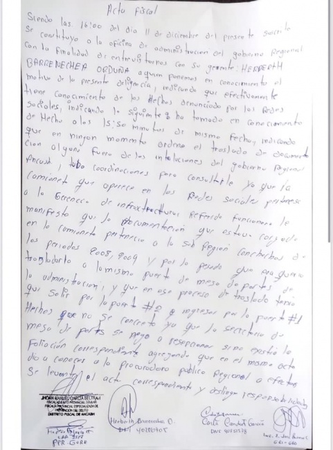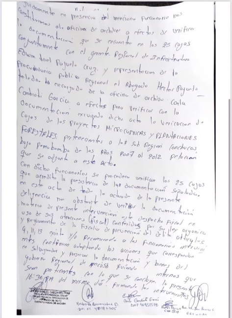 Personal del Gobierno Regional de Ancash (GRA), en presencia del titular adjunto del fiscal provincial de Prevención del Delito, Jhoan García Beltrán, aclaró que la documentación que apareció divulgado en medios de comunicación como si se pretendiera desaparecer de la sede regional, pertenece a la Sub Región Conchucos Bajo correspondiente al periodo 2007-2012.. La referida documentación reúne la información de proyectos forestales de mencionados años, que se pretendían trasladar a la gerencia regional de Administración para su revisión, hecho que no se concretó ya que faltaba el foliado, y por ello, se procedió a devolver a archivo regional, hecho que fue constatado por la Fiscalía y Procuraduría Regional. . El encargado de la gerencia de Administración del GRA, CPC. Herberth Barrenechea Orduña, aclaró que la institución brindó todas las facilidades a las autoridades del Ministerio Público, constatando en esta diligencia que las 25 cajas que iban a ser retiradas contenían documentos de los proyectos de microcuencas y plantaciones forestales de los referidos años, quedando constancia en el acta suscrita..